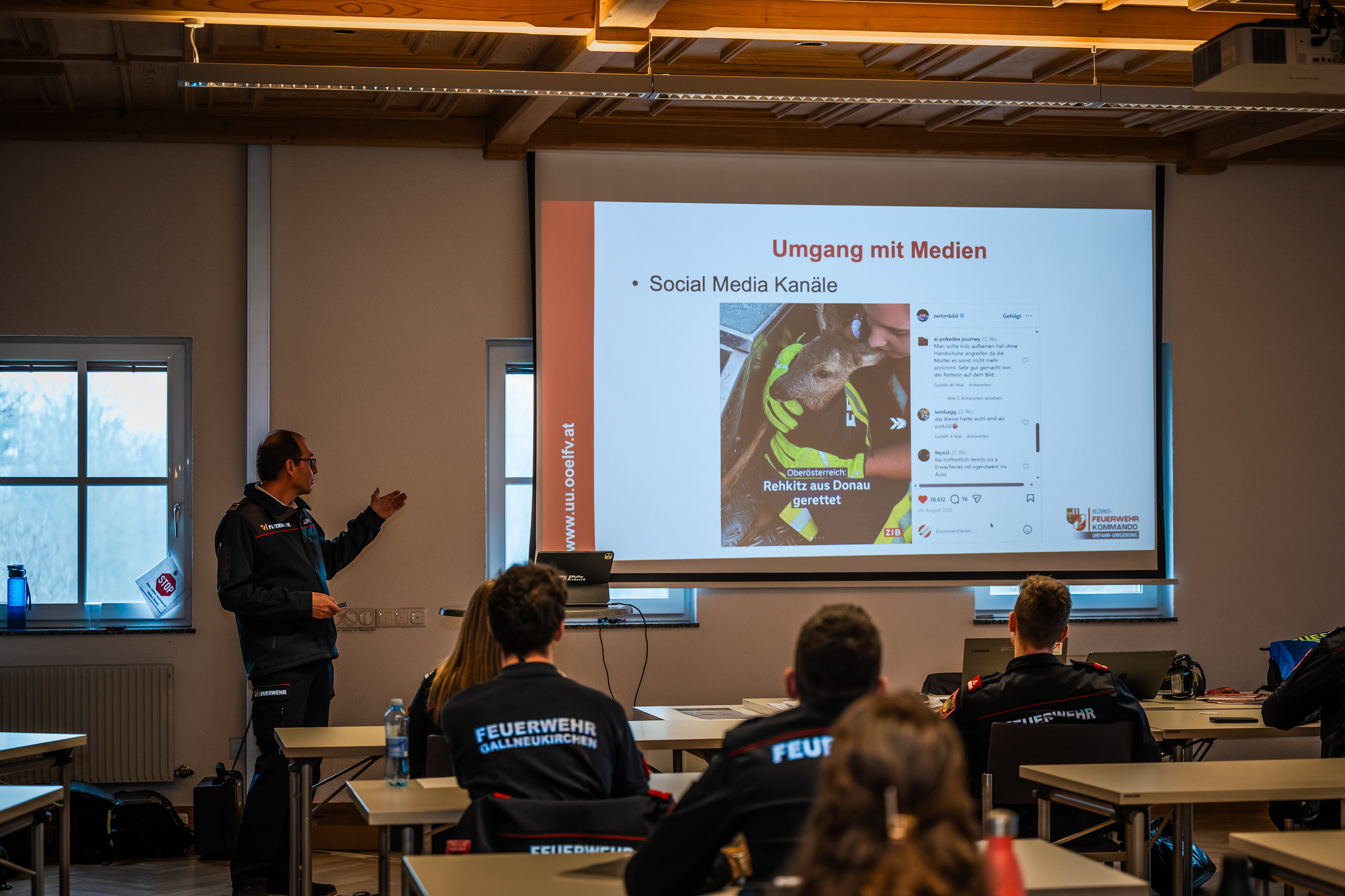 In der Bezirksfeuerwehrschule in der Bauakademie Lachstatt fand letzten Samstag, den 7. Februar, ein umfassendes Seminar zum Thema Öffentlichkeitsarbeit statt. Organisiert wurde dieser hochinteressante Lehrgang vom Team für Öffentlichkeitsarbeit des Bezirksfeuerwehr-Kommando Urfahr Umgebung, Phillip Prokesch, Tobias Schartner und Thomas Traxler. Im Mittelpunkt standen aktuelle Entwicklungen und Herausforderungen der Öffentlichkeitsarbeit im Feuerwehrwesen. Auch Bezirksfeuerwehrkommandant Johannes Enzenhofer nutzte die Gelegenheit, um den Anwesenden wichtige Impulse für eine zeitgemäße und verantwortungsvolle Kommunikation zu vermitteln. Für unsere Feuerwehr mit dabei war Lukas Birngruber. Danke für die Bereitschaft dafür und die Zeit am Lehrgang teilzunehmen.