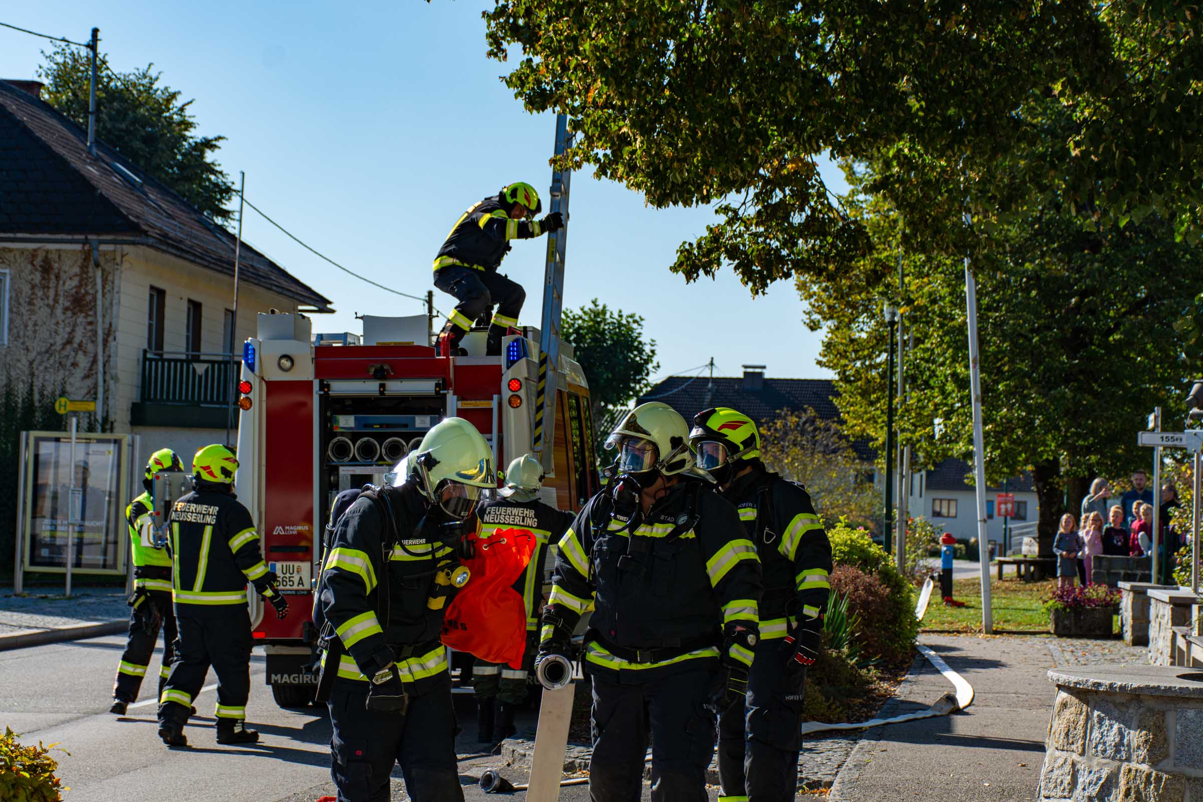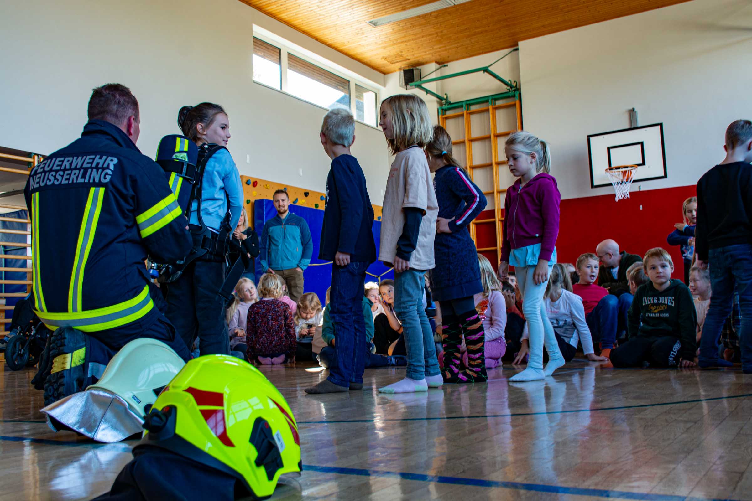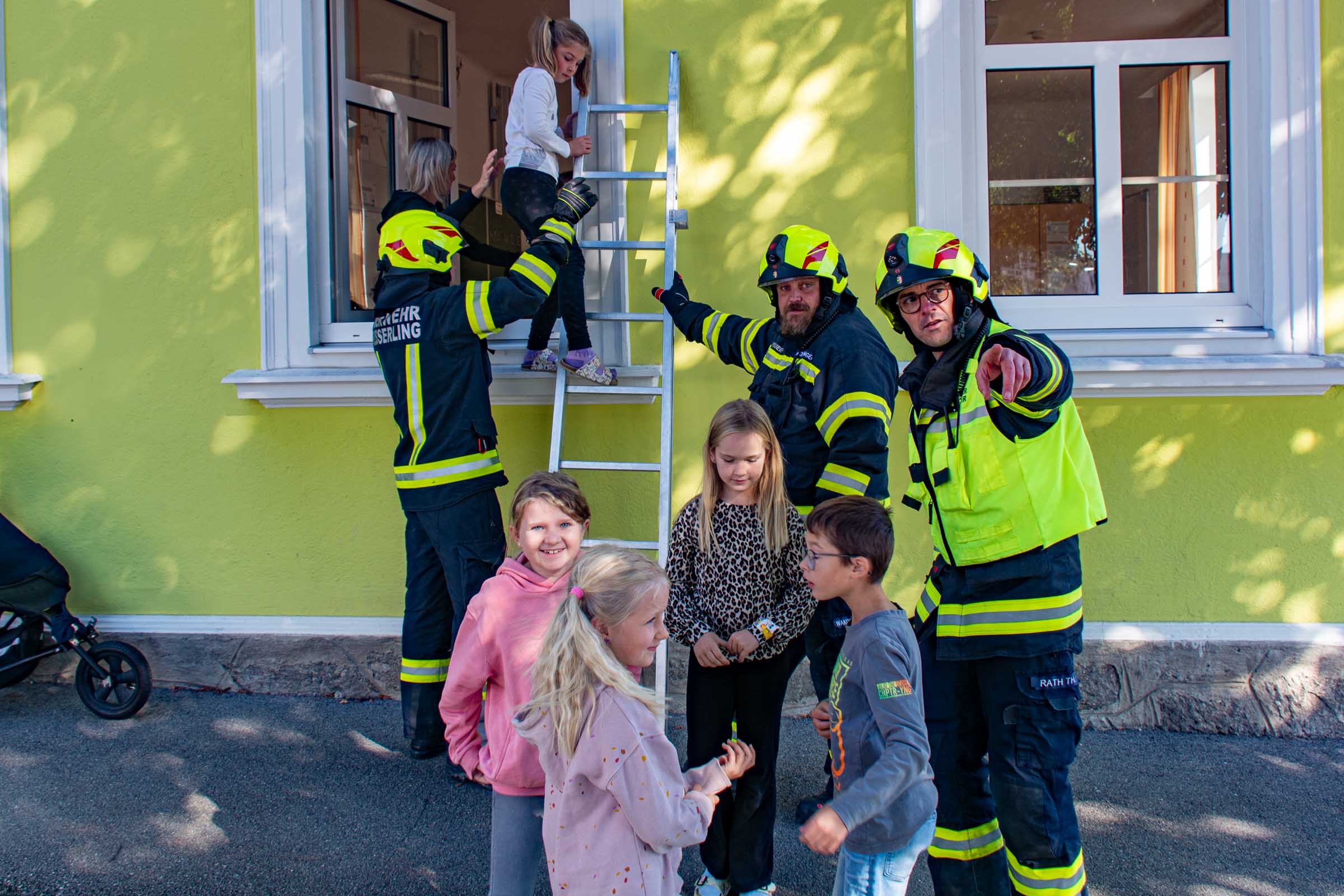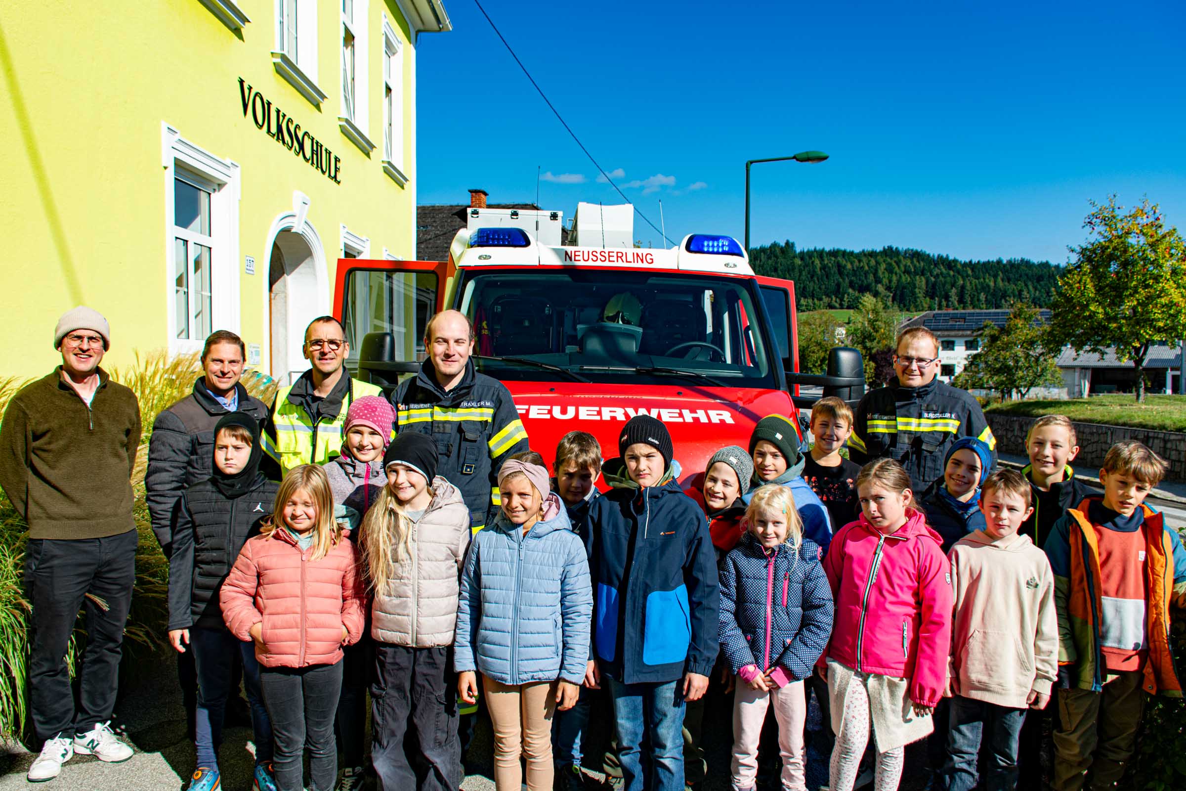Der Freitag, 3. Oktober, stand in der Volksschule Neusserling ganz im Zeichen der Feuerwehr. Höhepunkt dieses Schultages war für die Kinder die jährlich stattfindende Räumungsübung. Das Übungsszenario war diesmal ein Brand in der Garderobe. Den Kindern mit ihren Lehrern war somit der Fluchtweg durch den Haupteingang versperrt und es müsste der Nebenausgang benutzt werden. Eine Klasse im Erdgeschoss wurde über die Leiter durch das Fenster evakuiert. Der Atemschutztrupp hat ein Kind durch das Gebäude gerettet. Die Schüler der Vierten Klasse, bereits traditionell, durften dann abschließend noch eine Runde mit dem Feuerwehrauto mitfahren.