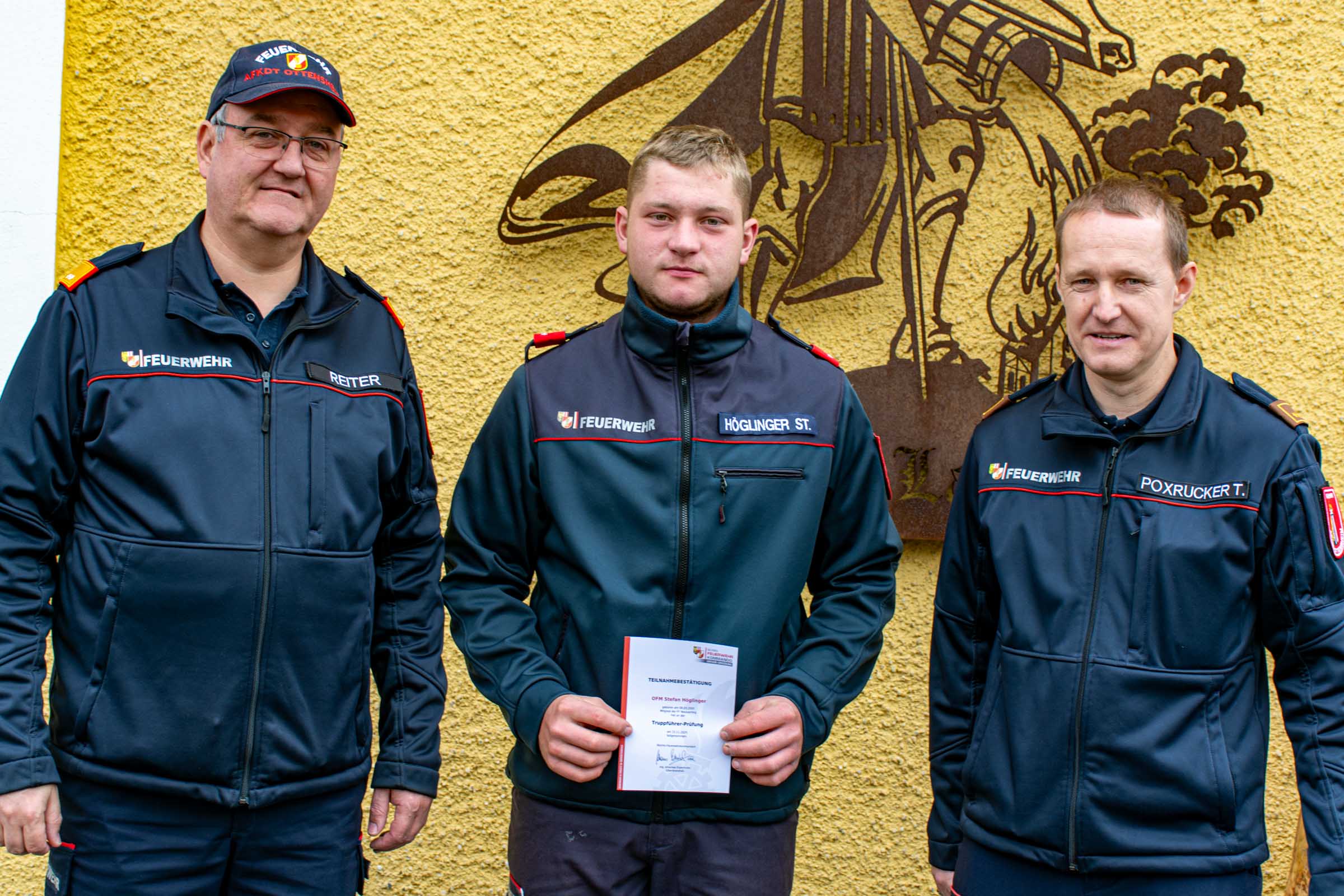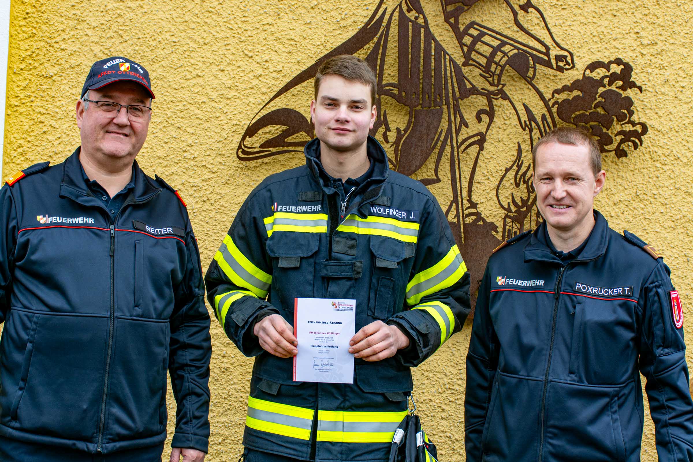 Herzliche Gratulation an Tobias Hötzmannseder, Stefan Höglinger und Johannes Wolfinger zur bestandenen Truppführer Prüfung. Einer erfolgreichen Prüfung gehen zahlreiche Stunden an Übungen in Theorie und Praxis voran. Die Teilnehmer lernen dabei feuerwehrspezifische Fragen aus diversen Fachbereichen. Darüber hinaus sind praktische Aufgaben aus Einsatzszenarien zu beherrschen. Die abschließende Prüfung dieser Ausbildung fand im Feuerwehrhaus der Freiwilligen Feuerwehr Lacken statt, wo sich alle teilnehmenden Kameraden aus unserem Abschnitt dieser Prüfung unterzogen. Unser Abschnittskommandant, BR Kurt Reiter MSc und OBI d. F. Dipl. Ing. (FH) Thomas Poxrucker überreichten abschließend die Zertifikate. Die positive Truppführer Ausbildung berechtigt die Kameraden in weiterer Folge auch zur Absolvierung nachfolgender Lehrgänge auf Bezirks- und Landesebene. Vielen Dank an das Team der Prüfer und an die Freiwillige Feuerwehr Lacken für die Räumlichkeiten.