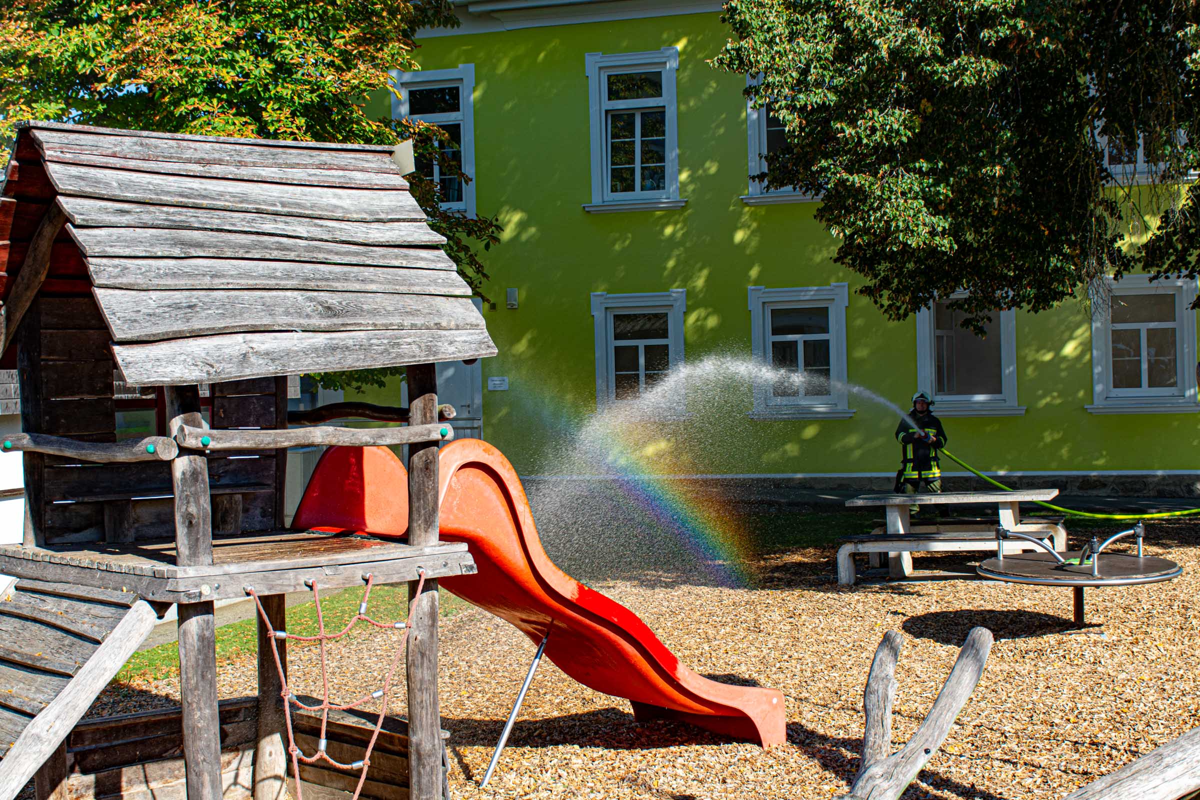Der Freitag, 3. Oktober, stand in der Volksschule Neusserling ganz im Zeichen der Feuerwehr. Höhepunkt dieses Schultages war für die Kinder die jährlich stattfindende Räumungsübung. Das Übungsszenario war diesmal ein Brand in der Garderobe. Den Kindern mit ihren Lehrern war somit der Fluchtweg durch den Haupteingang versperrt und es müsste der Nebenausgang benutzt werden. Eine Klasse im Erdgeschoss wurde über die Leiter durch das Fenster evakuiert. Der Atemschutztrupp hat ein Kind durch das Gebäude gerettet. Die Schüler der Vierten Klasse, bereits traditionell, durften dann abschließend noch eine Runde mit dem Feuerwehrauto mitfahren.